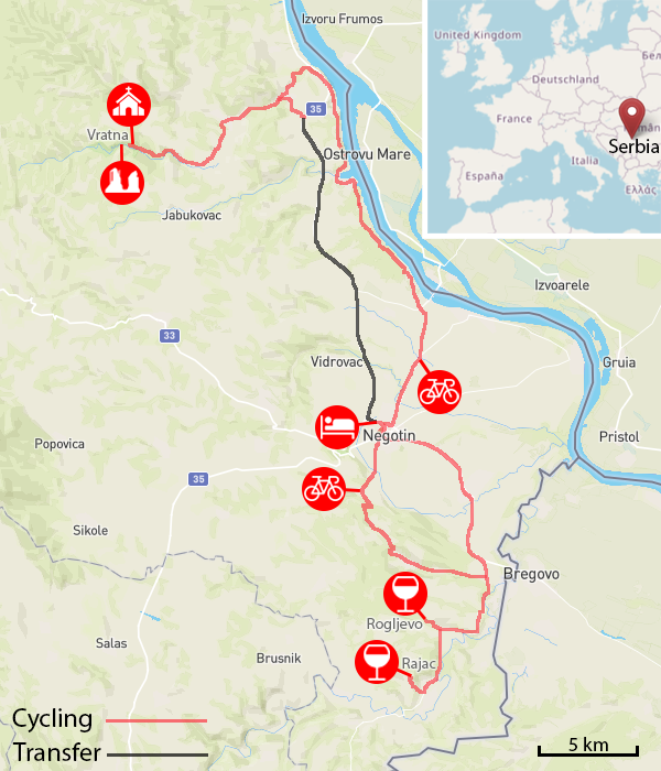 Getting off from Negotin we cycle along the Danube passing the villages of Mala Kamenica and Mihajlovac. After leaving the mighty Danube river we ride on small country roads through picturesque rolling sceneries of forests and farmlands. Our goal is the 14th-century Orthodox monastery Vratna. where we have a picnic lunch. From there we stroll another kilometre to the formation of stone gates shaped by the river Vratna. We bike back to the village of Slatina where we get into a minibus and transfer to Negotin.